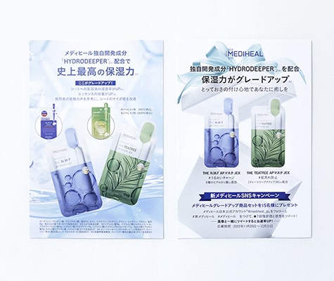 韓国発スキンケア化粧品ブランド『MEDIHEAL』のマスクシートの商品同梱・イベント配布用としてのはがきサイズのリーフレット制作。